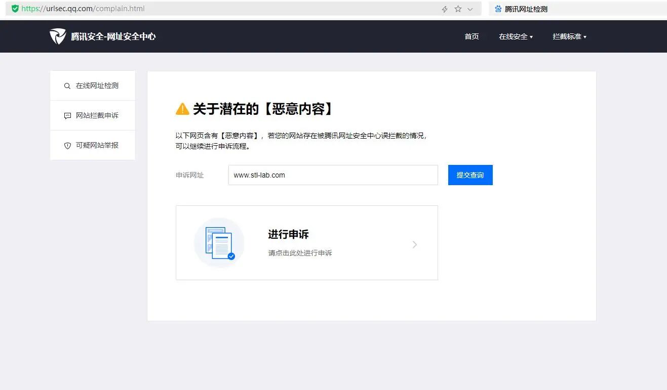 www.stl-lab.com 微信内访问网站出现“无法确认该网页的安全性,请谨慎访问”的拦截提示,网站符合《微信外部链接内容管理规范》,腾讯安全网址安全中心检测网页没有不安全的内容,请求核实后解除在微信内的访问拦截提示,谢谢。这个是企业网站备案号是 粤ICP备19089452号。腾讯网址检测也是正常