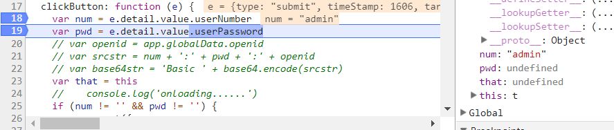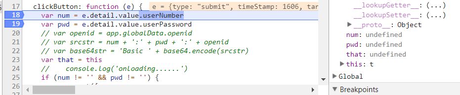 ↑在第18行处设置断点发现num、pwd、that的值都是undefined