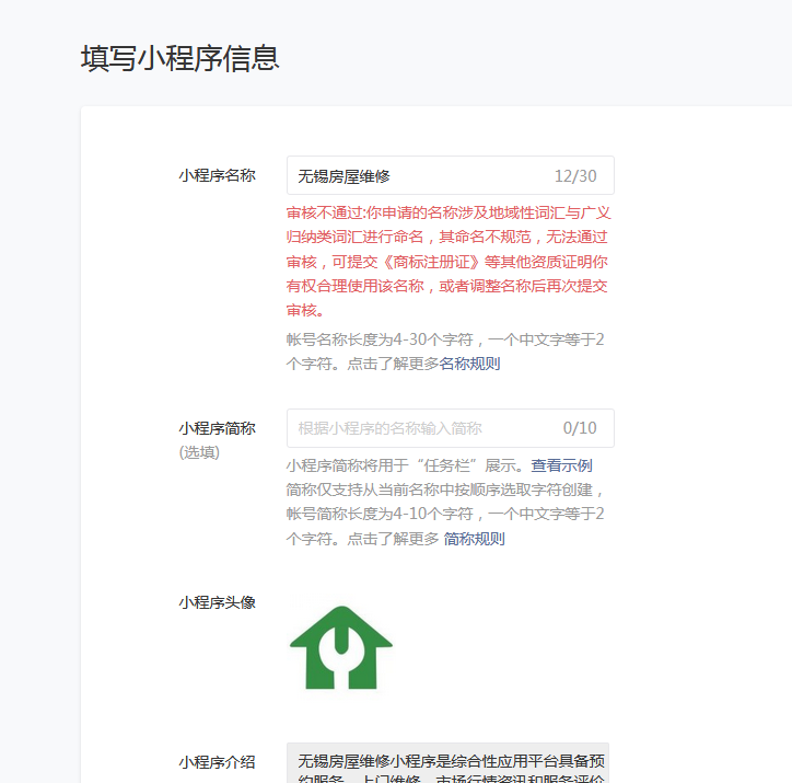 公众号名称是“无锡房屋维修”,小程序名称也想申请为“无锡房屋维修”,但是一直不过。小程序的appid:wxdcebe5f0977ae8c8