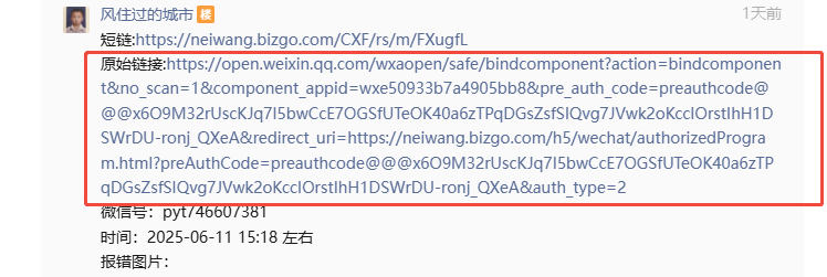 原始链接:https://open.weixin.qq.com/wxaopen/safe/bindcomponent?action=bindcomponent&no_scan=1&component_appid=wxe50933b7a4905bb8&pre_auth_code=preauthcode@@@x6O9M32rUscKJq7I5bwCcE7OGSfUTeOK40a6zTPqDGsZsfSIQvg7JVwk2oKccIOrstIhH1DSWrDU-ronj_QXeA&redirect_uri=https://neiwang.bizgo.com/h5/wechat/authorizedProgram.html?preAuthCode=preauthcode@@@x6O9M32rUscKJq7I5bwCcE7OGSfUTeOK40a6zTPqDGsZsfSIQvg7JVwk2oKccIOrstIhH1DSWrDU-ronj_QXeA&auth_type=2
