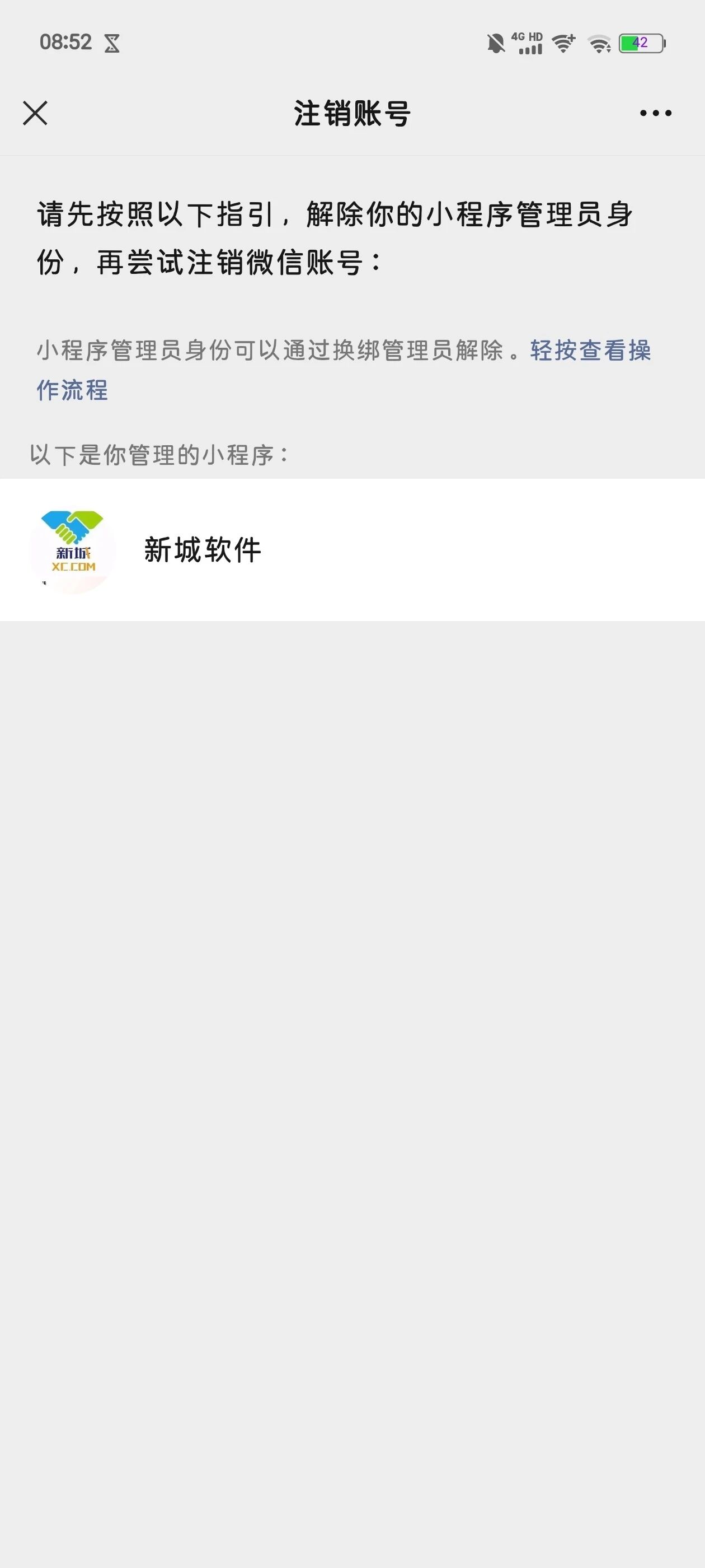 注销微信时提示有管理员身份未解除,但是又无法登录小程序,也无法找回小程序,请管理管人工解除 谢谢~ 原始ID:gh_5584b047f330
