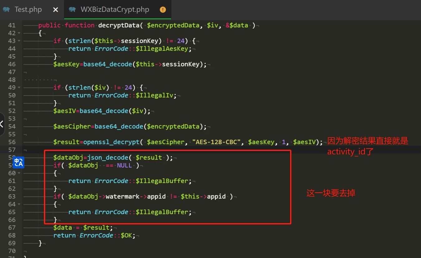 官方示例代码有问题,因为demo是userinfo的解密,需要解析为json。但私密消息的解密结果直接是activity_id,所以私密消息是不能json_decode的,否则会显示IllegalBuffer