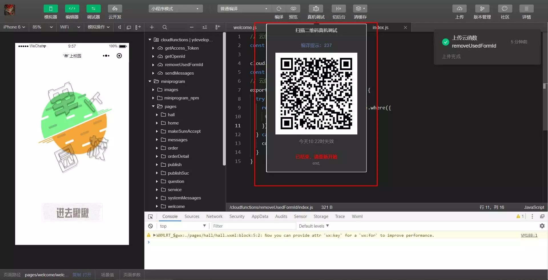 一用手机扫调试的码,就显示调试结束。不知道为什么,手机显示服务器好像是断开的。前几次都没有这个问题