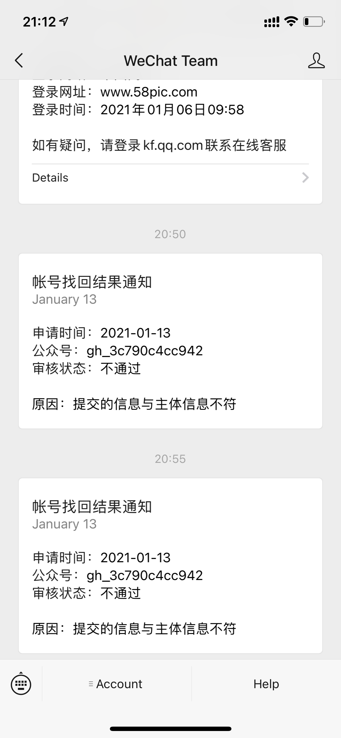 扫码登录公众号显示有冻结的的账号,想要找回注销,找回结果不通过,可是主体就是我啊,要不怎么会扫码扫出来呢