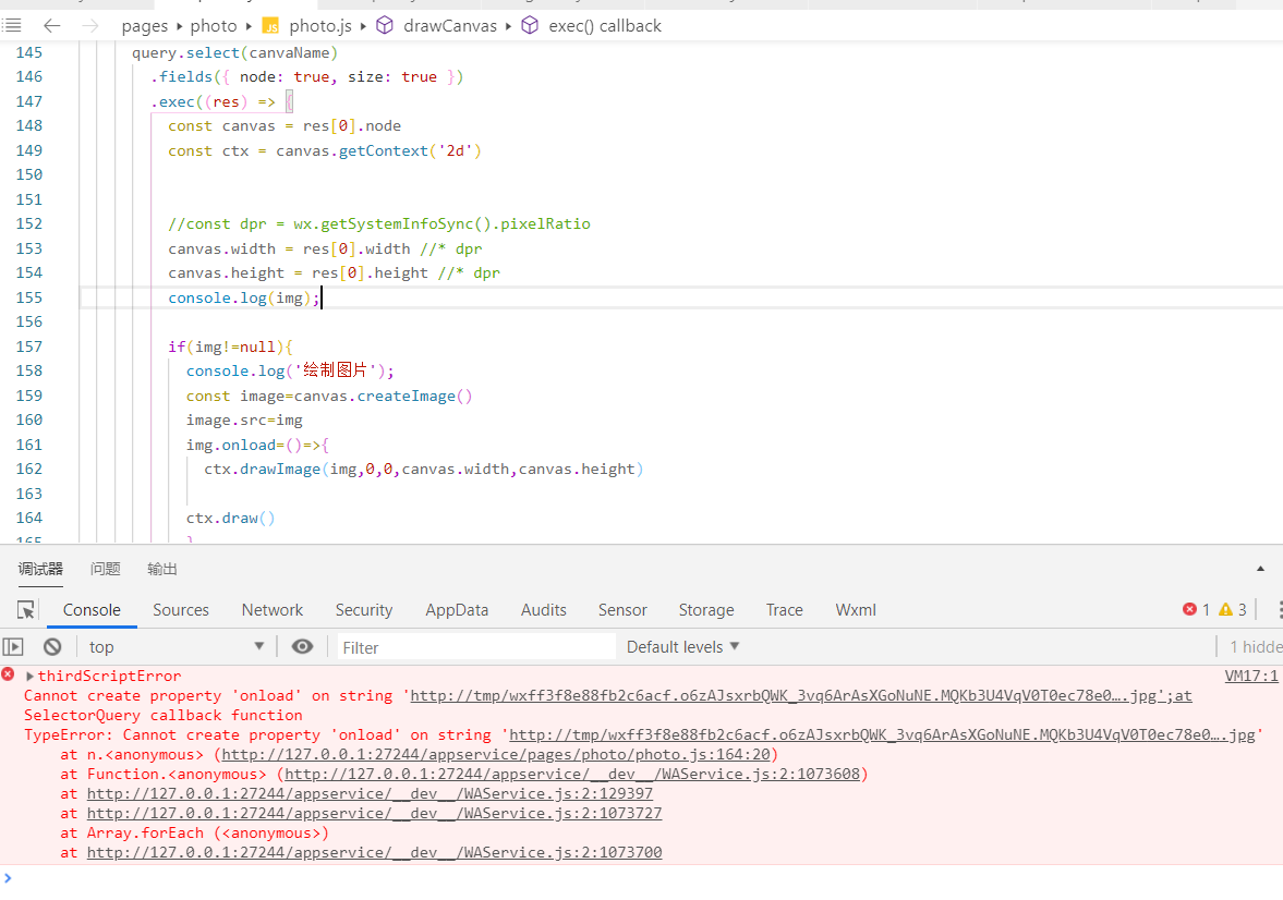 // wxml // <canvas canvas-id="cv1"></canvas> // // js // ctx1 = wx.createCanvasContext('cv1') // ctx1.drawImage(tmpfile, 0, 0, width, height) // ctx1.draw(false, res => {}) // 其中tmpfile来自wx.chooseImage: res.tempFiles.path
