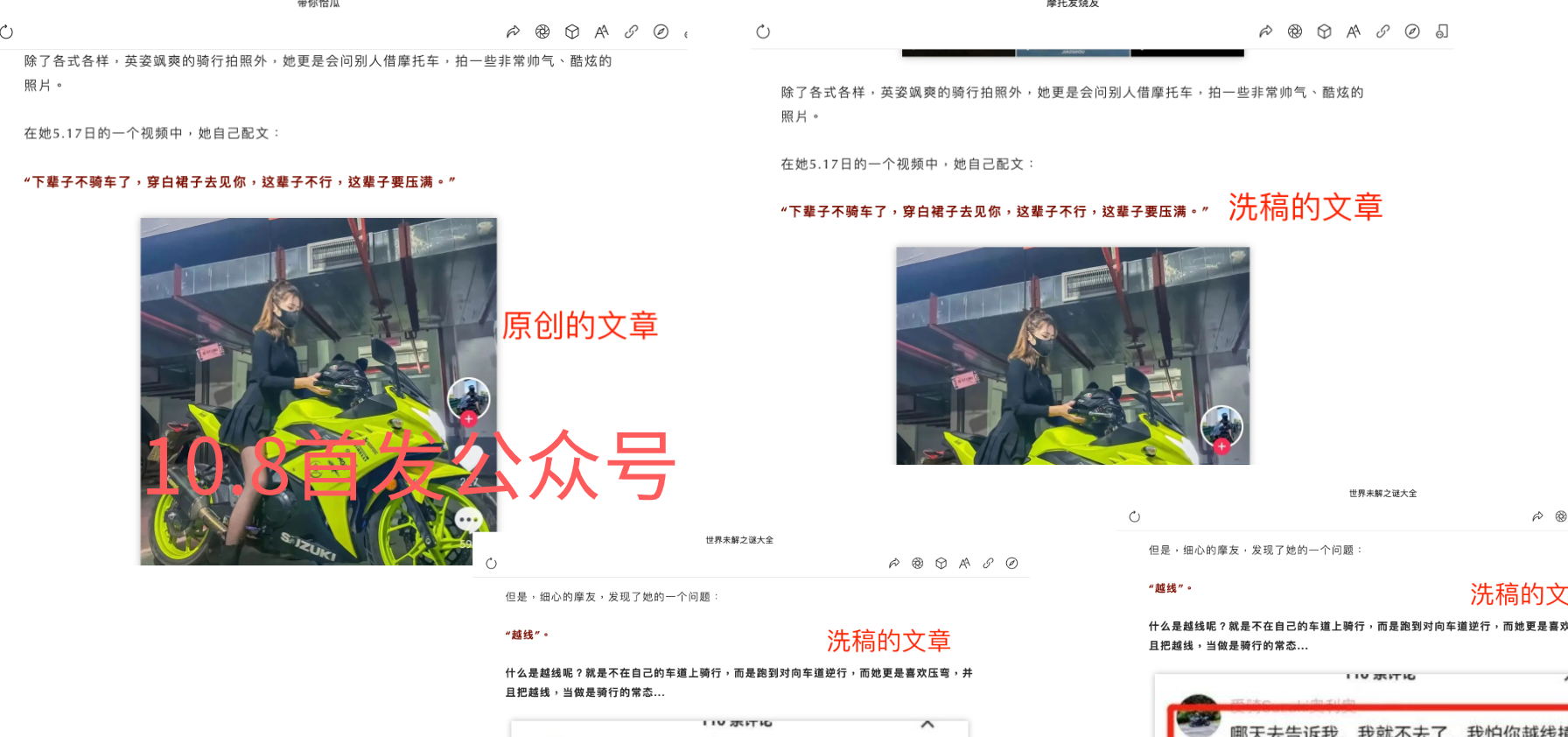 请看文中正文部分,一模一样,连文字都不带改的,所以所谓的“你的内容早已在网络平台或其他渠道广泛传播”,都是我本人写的,被人洗稿、拼接了!