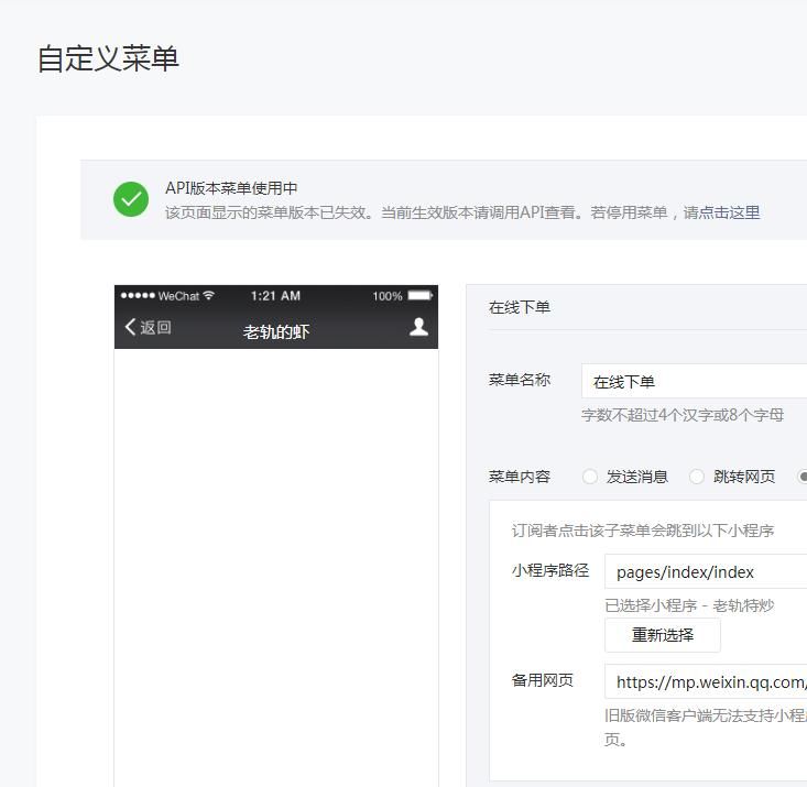 公众号内配置自定义菜单时是这样的结果。 如何使当前页面生效?