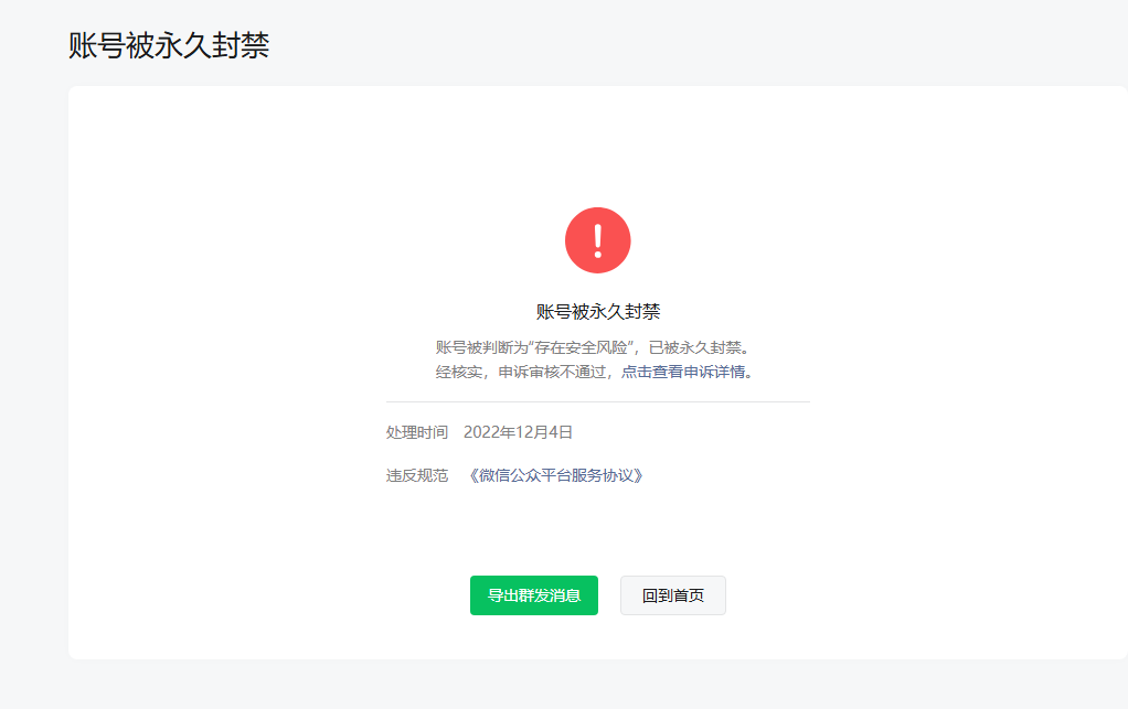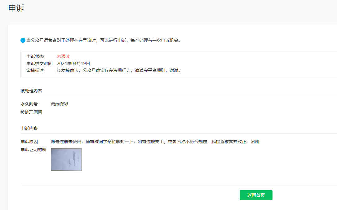 以前注册的公众号名称"高端微彩"注册邮箱5988958533@qq.com 在2022年的时候,没有发表任何文章,判定违规,我一头雾水,也不知道哪里出题,就申诉说解封我把账号注销了,但是没有通过,请核实。一篇文章都没有发表过是不是搞错了。我的公众号名字或者简介有问题吗,提示我修改不行吗有必要封号吗。请官方核实