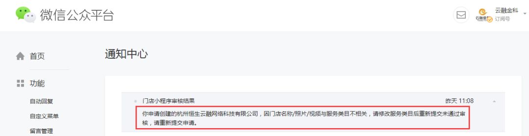 我们公众号的名称“云融金科”它的公司主体就是--杭州恒生云融网络科技有限公司,为什么添加门店时,会审核不通过,提示“不相关”