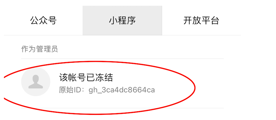 在公众平台安全助手服务号上搜索绑定的小程序,发现一个显示"该账号已冻结"