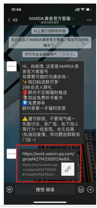 红色框框部分,点击进去就是企业微信建造的外部群的群二维码(用链接的好处:1、满200人自动生成新群;2、群二维码会自动更新)