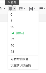 而编辑器格式菜单统一收归至工具栏,前后插入段落按钮调整至工具栏的段前、段后距的菜单中
