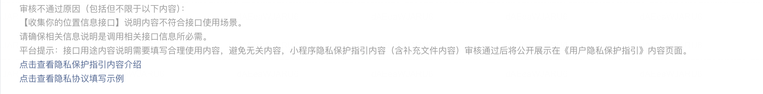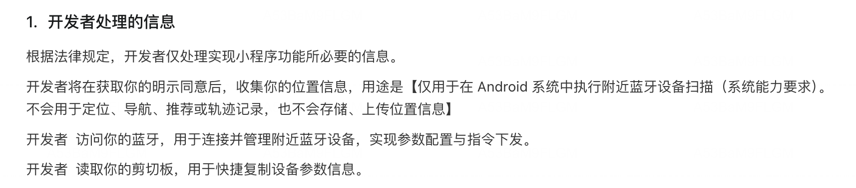 图片上是我最后一次提交的,我感觉也无法通过。但是我实在是不知道怎么填写了,因为安卓系统中使用蓝牙功能必须打开位置信息才能使用。我哦填写了很多版本都没有通过。我想问一下,这个到底怎么填写