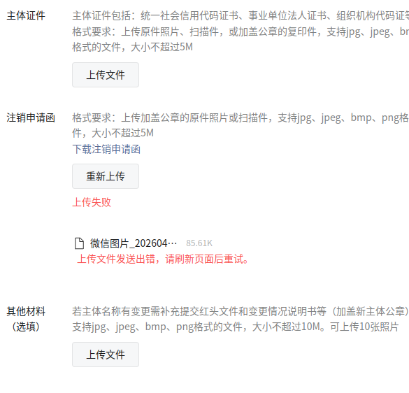 政府类主体支持提交无对公账户注销申请,注销入口:登录账号后台-设置与开发-账号设置-账号详情-注销账号-填写对公账号字段下方有“无对公账户”提交入口,按提示多次提交资料后显示系统错误上传失败,该怎么解决?