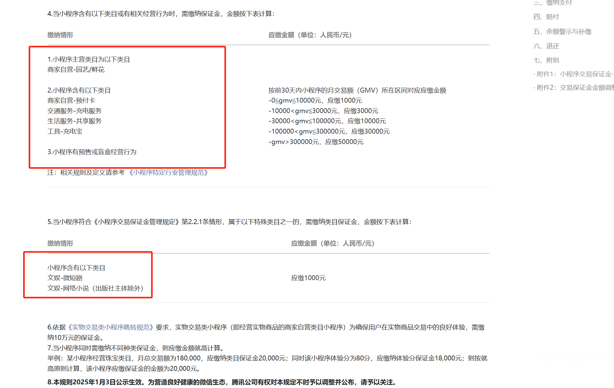 小程序存在特定类目,涉及到特定类目的需要商家缴纳保证金可以查看下图片里面框起来的类目。