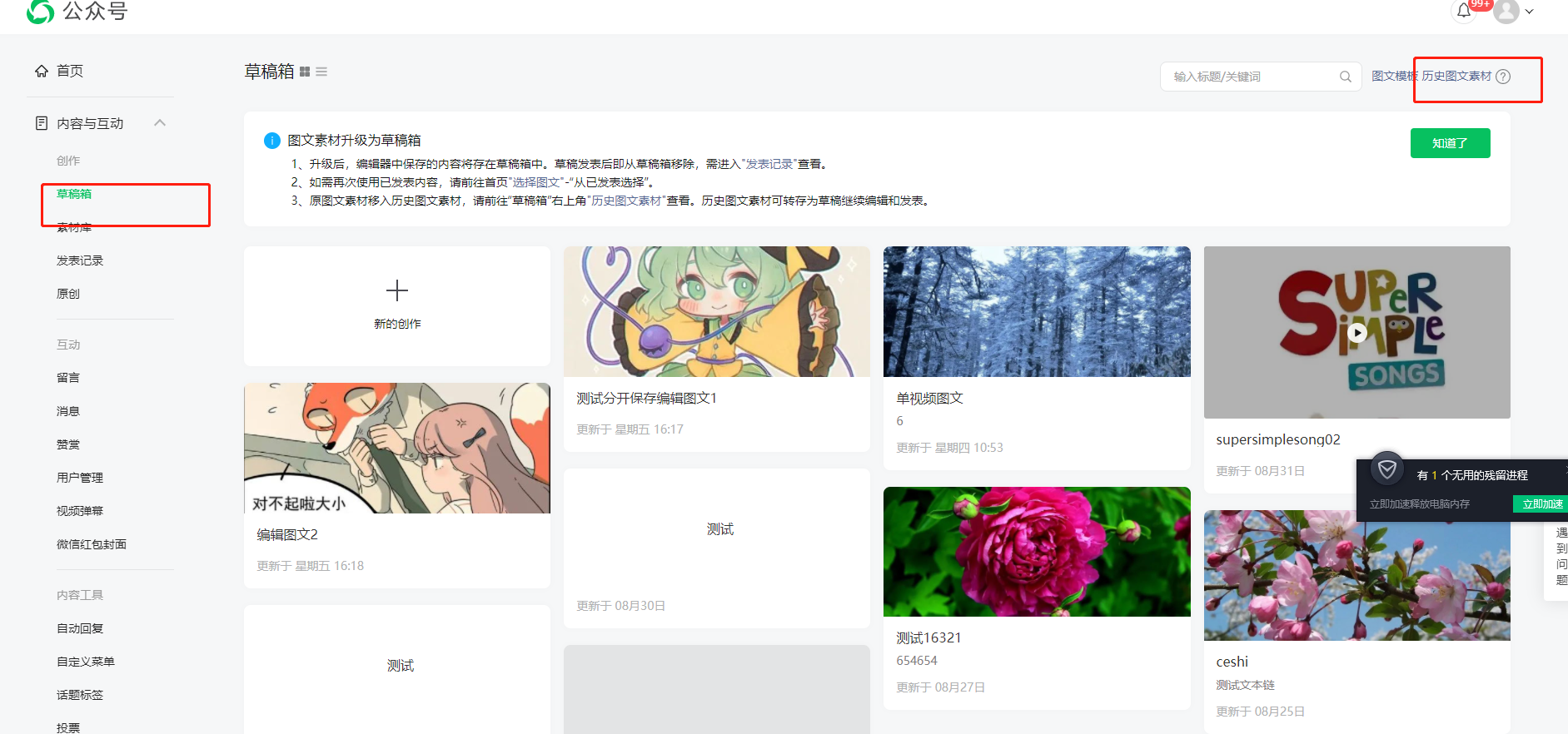 那是给升级草稿箱以前的公众号图文素材准备的,他们升级前的那些素材会进入历史图文素材。
