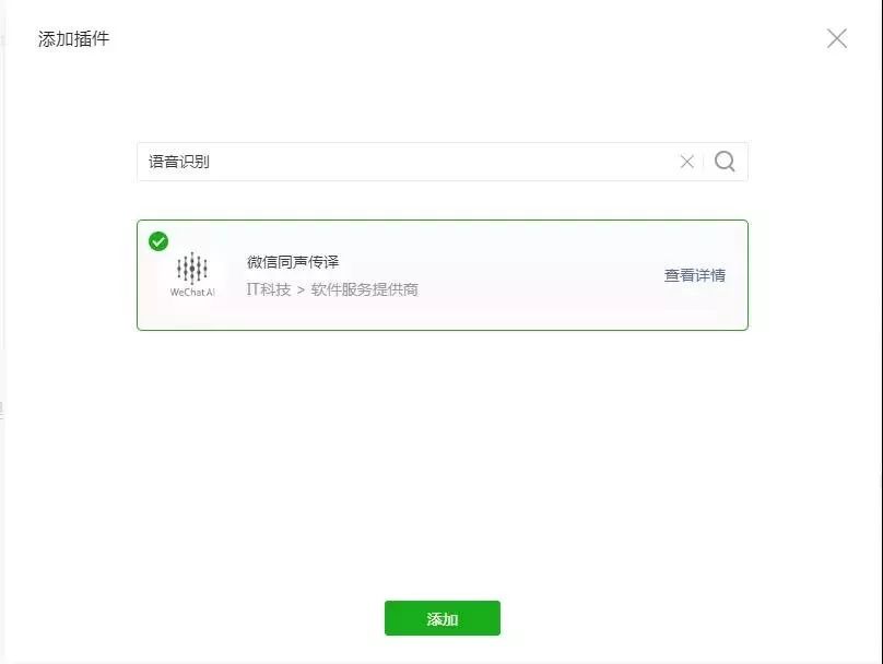 4 输入“同声传译”或者“语音识别”、“翻译”等搜索关键字搜索插件并添加,同时可以点击“查看详情”,获取插件的详细介绍、接入说明和开发文档。