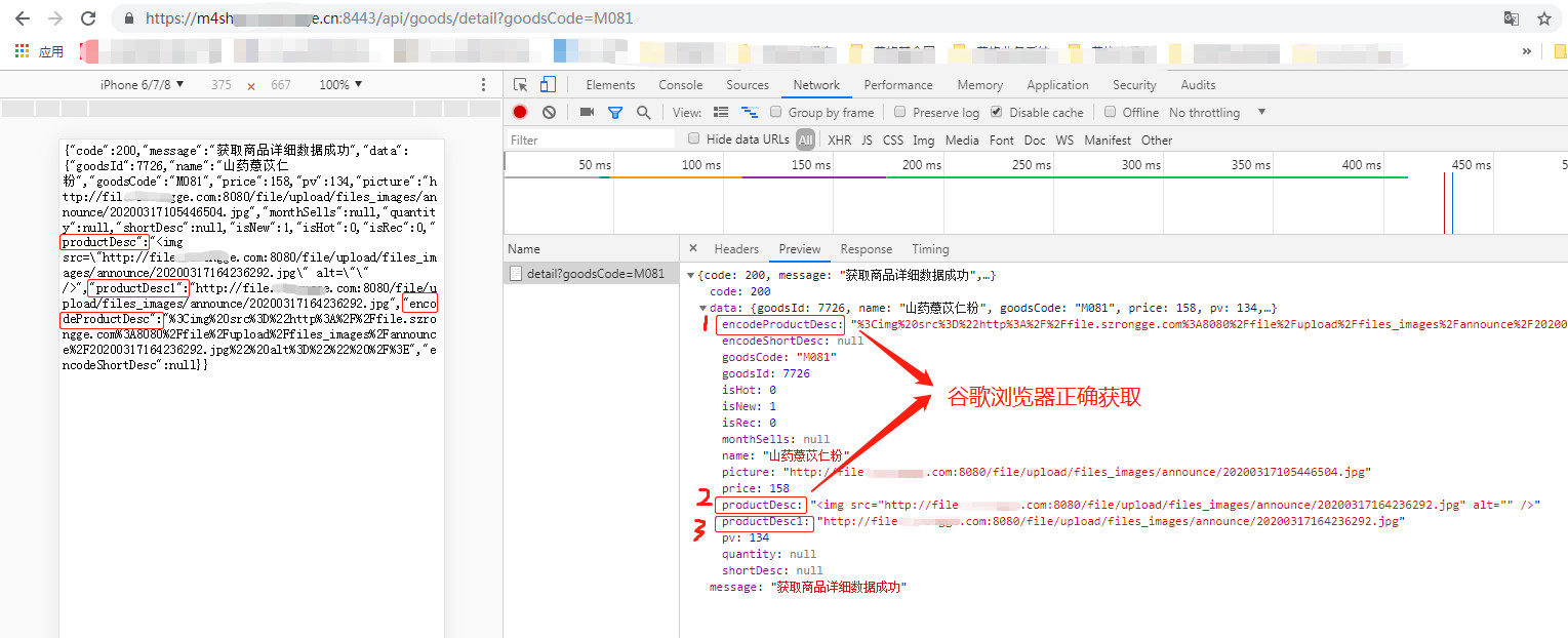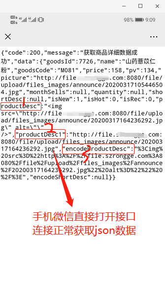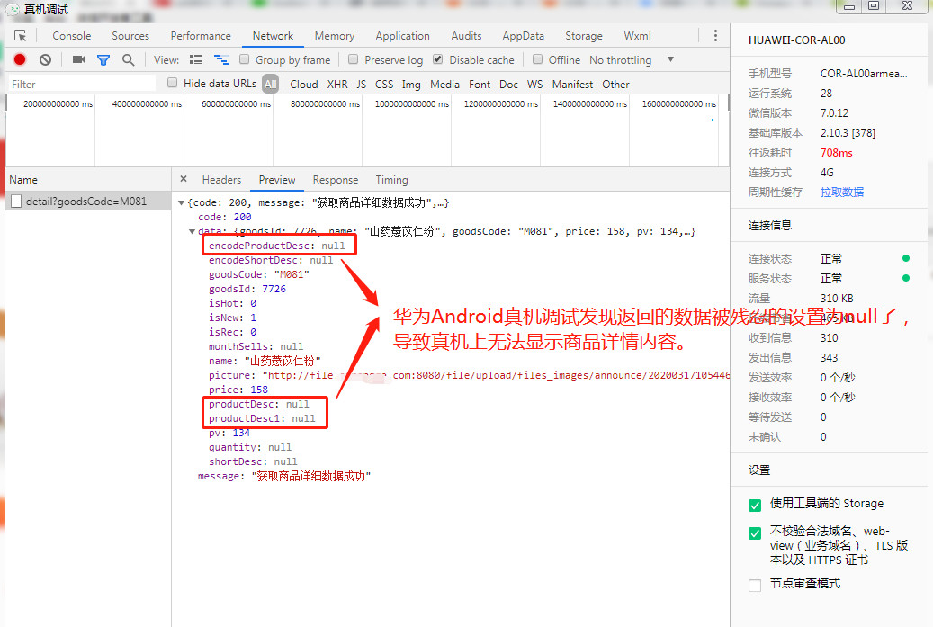 同一个商品详情页获取接口(https://m4sh***.***.cn:8443/api/goods/detail?goodsCode=M081),谷歌浏览器可以正确获取商品详情json数据,微信中直接打开接口连接也能正确获取商品详情json数据,但是Android手机中打开小程序未能正确获取商品详情json数据,商品详情描述字段network查看被置为nul了,而IOS手机访问是正常的。目前小程序都上线了,商品详情Android手机却出不来,急死了!跪求官方和各位大神帮忙解决下这个问题!