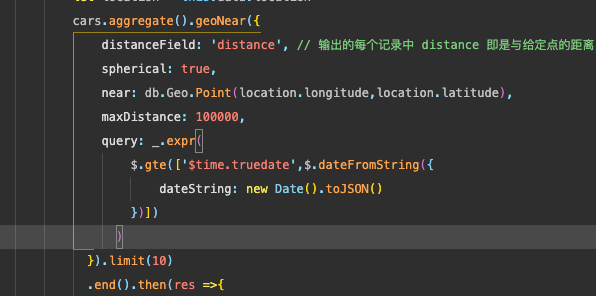 由于geoNear这个尴尬的方法必须用在聚合第一个阶段,数据库很大又不想把limit放到太大,导致应该写在match里的条件语句要写到geoNear的query里,是一个时间比较条件,实在是不会写了,用where的写法也不对,用match的写法也不对,加了expression也不对,求大神救救我吧。。。