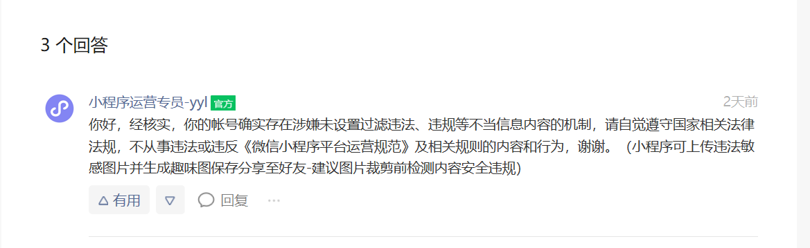 @小程序运营专员-yyl 我们就是在从相册选择图片后就进行了图片检测的,麻烦问下您审查的时候是哪块上传图片后没有进行检测??可以说的清楚点吗?