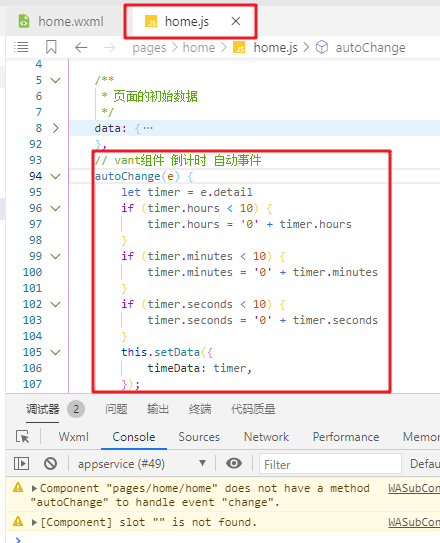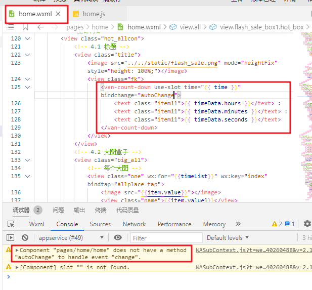 Component "pages/home/home" does not have a method "autoChange" to handle event "change"