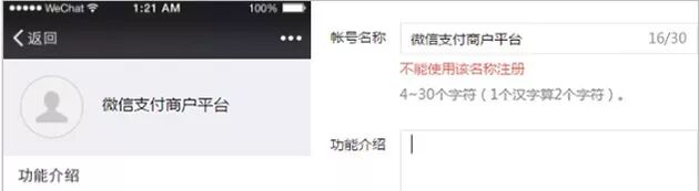 举例说明:在注册公众帐号的时候,昵称时输入的是“微信支付商户平台”,但系统提示“不能使用该名称注册”,出现这个提示是由于系统检测到您填写的公众号名称是微信保护名称,不允许注册,请更换其他的名称完成注册。