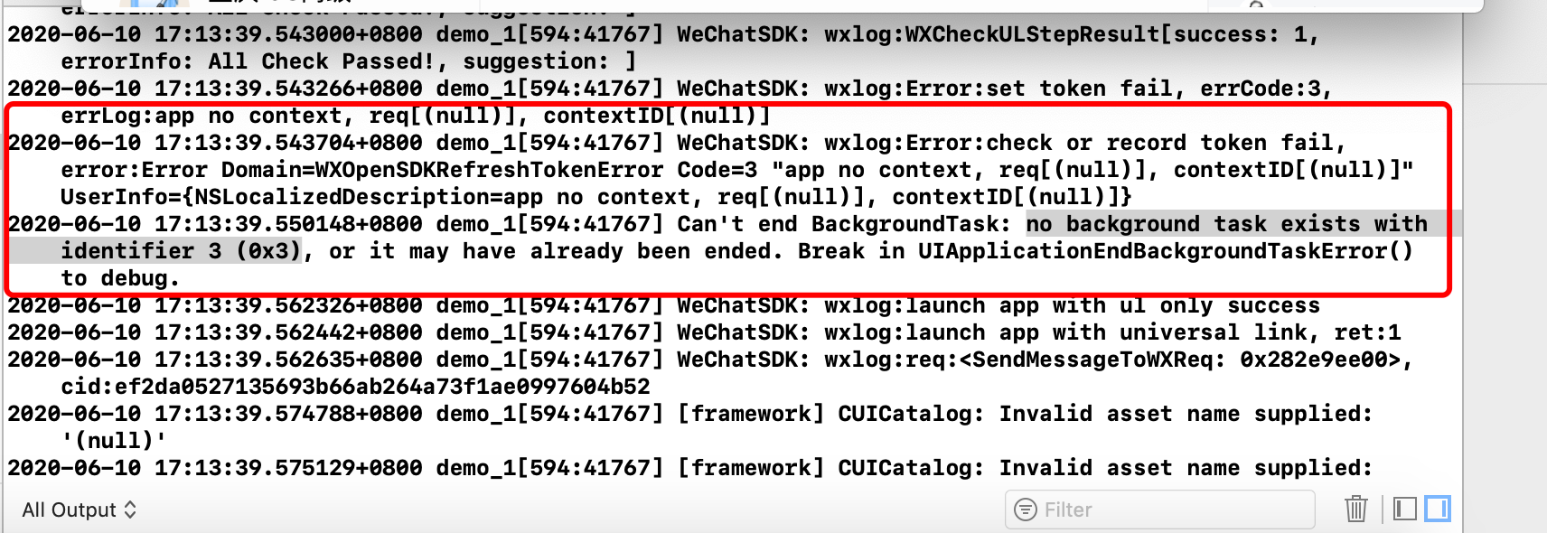 2020-06-10 15:11:10.732643+0800 demo_1[327:6115] checkUniversalLinkReady:WXCheckULStepResult[success: 1, errorInfo: All Check Passed!, suggestion: ]
