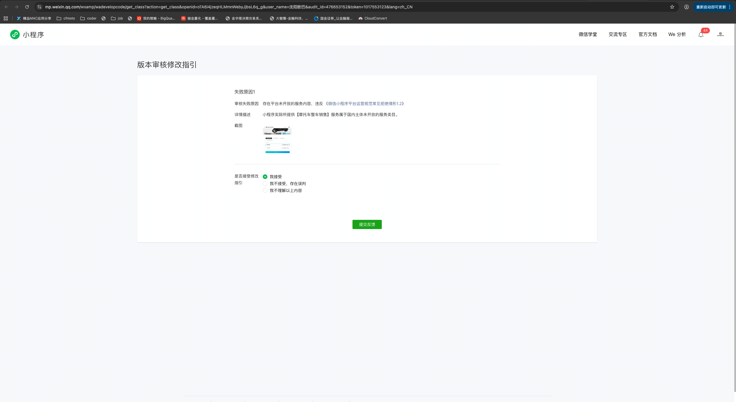 内容:审核人以“小程序实际所提供【摩托车整车销售】服务属于国内主体未开放的服务类目。”为由审核不通过,但是小程序上线5年多了一直上线了整车销售的内容,此次为首次拒审,请其它相关人员共同评估,以下为审核记录截图: