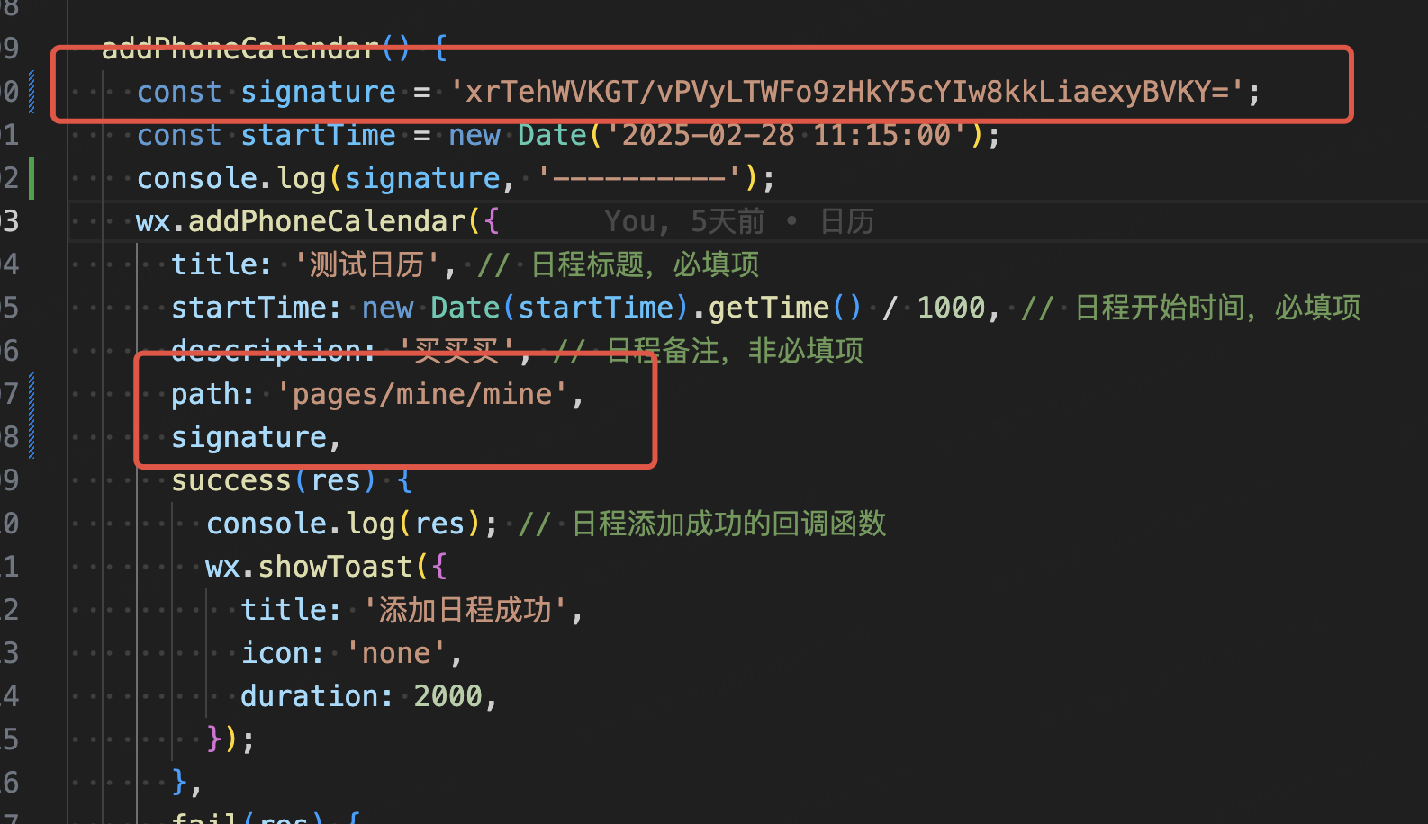 想问下signature如何生成,添加日历后跳回小程序的代码示例有吗