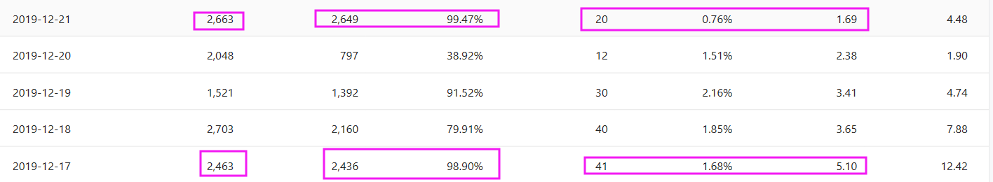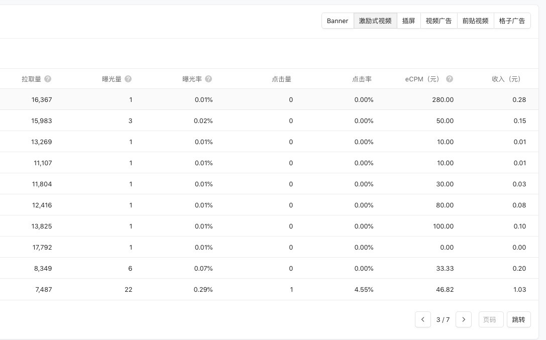 我的小程序开通流量主后,从开始的ecpm 5.1 一直下降到1.69 ,特别是拉取、曝光、点击差不多的情况下,具体看下图: