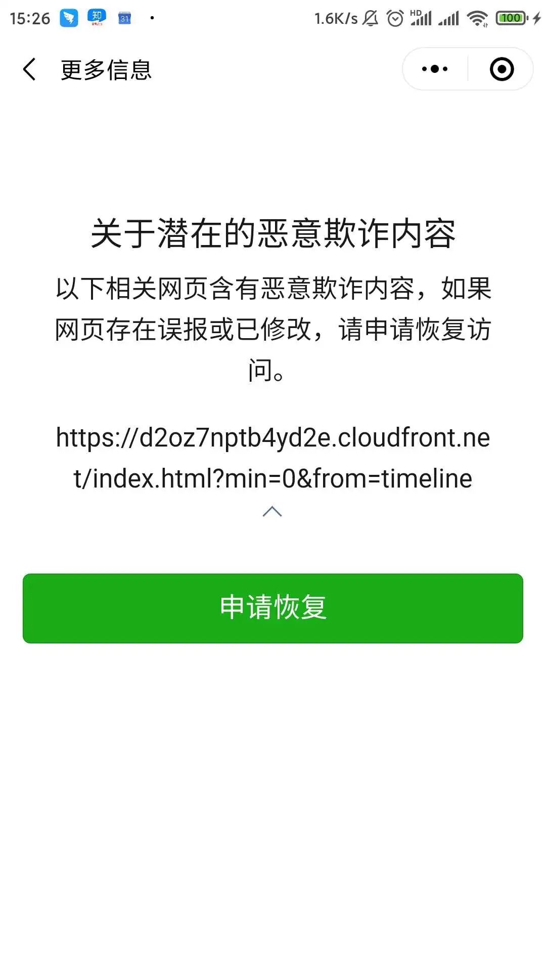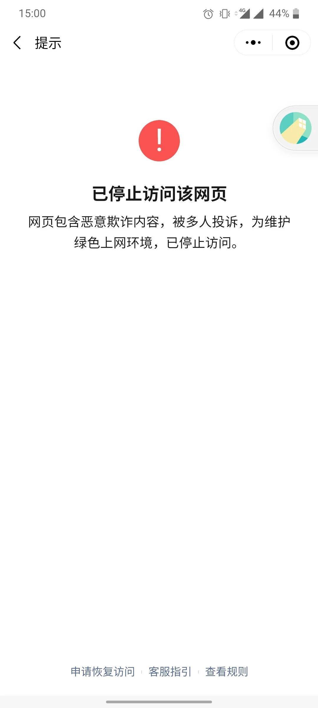 使用安卓机浏览小程序中的全景VR页面时,会提示已停止访问该网页,IOS机型没有提示。我们自查了小程序本身是没有截图中提示的恶意链接的,在业务域名中也没有配置过该域名,在微信中用网址或是在浏览器中来访问这些全景VR页面时可以正常播放,不会提示停止访问。