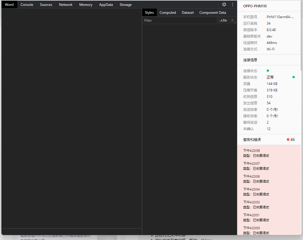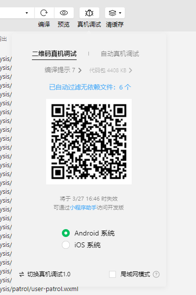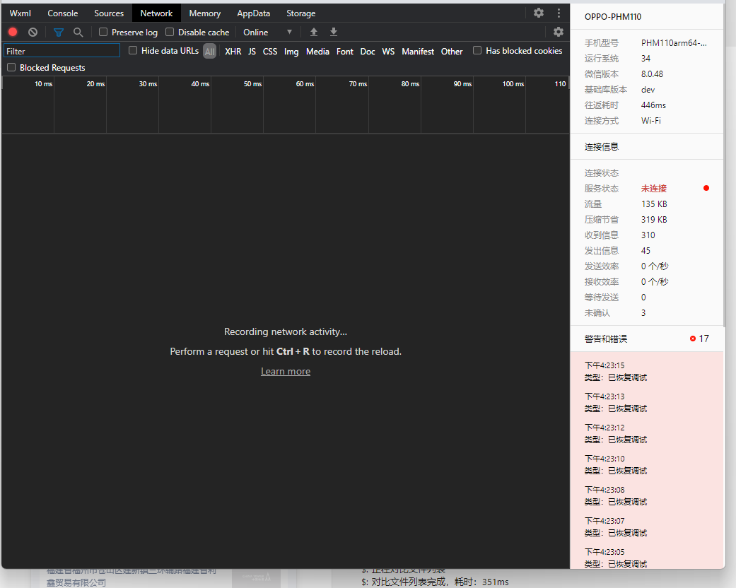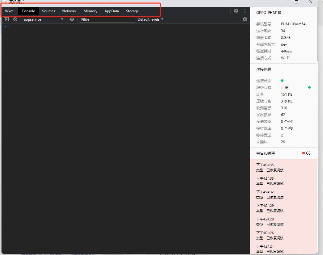 真机调试时无反应,使用的真机调试2.0模式,console没有打印,wxml及network也没有对应输出,ios正常