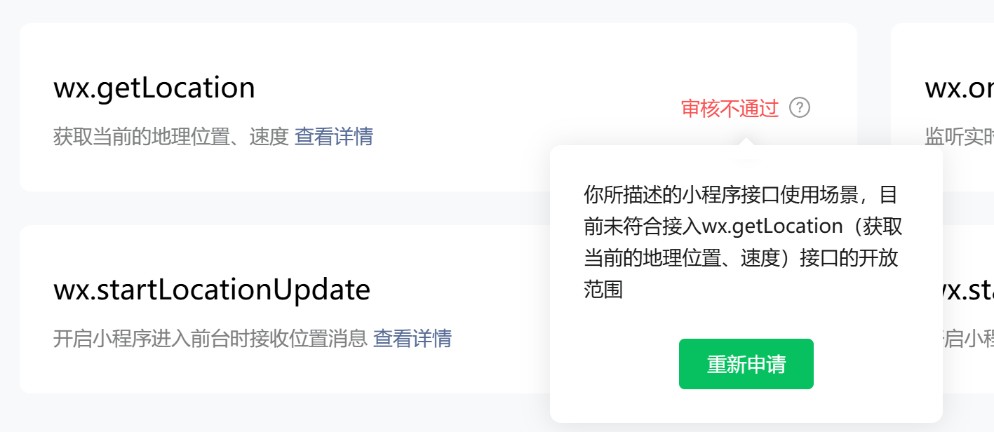 你好,核实到小程序申请wx.getLocation接口审核不通过,根据提交的申请信息可知申请该接口是用于【获取用户定位以便推荐最近电影院信息】,不符合wx.getLocation接口使用场景开放范畴。建议使用wx.getFuzzyLocation、wx.chooseLocation或wx.choosePoi、wx.chooseAddress接口实现上述场景。若含有线下电影院导航服务,可以支持wx.getLocation接口,建议提供小程序内线下电影院导航相关截图和完整录屏(含小程序昵称)重新提交。可参考相关案例解析:https://developers.weixin.qq.com/community/develop/doc/000646718d40a08a65ed1e2175bc09