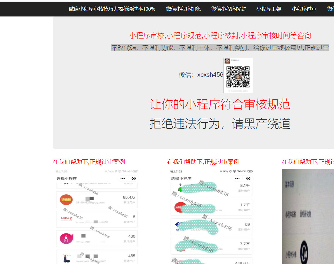 对于此类审核包过、加速审核的广告,请开发者不要上当受骗,以免自己的小程序受到牵连处罚。如果大家有发现存在此类问题的案例,欢迎向我们反馈,平台确认后会进行相应的处罚。