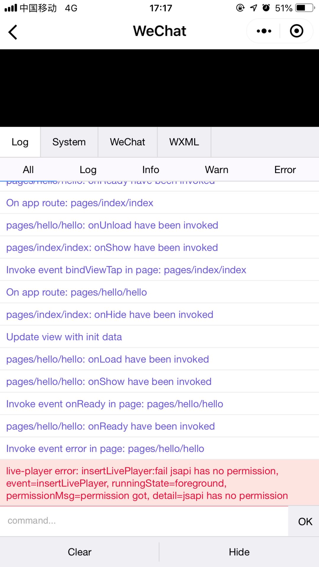 live-player error: insertLivePlayer:fail jsapi has no permission, event=insertLivePlayer, runningState=foreground, permissionMsg=permission got, detail=jsapi has no permission