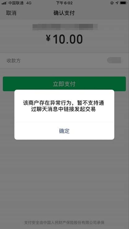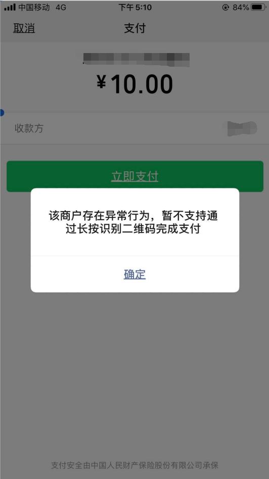 在后台查看没有任何异常行为,但是目前用户只可以直接扫码支付,长按识别和点击链接支付都提示商户存在异常行为,请问这个怎么解决?如果是不支持是否应该提示支付失败,而不是我们的商户异常呢?