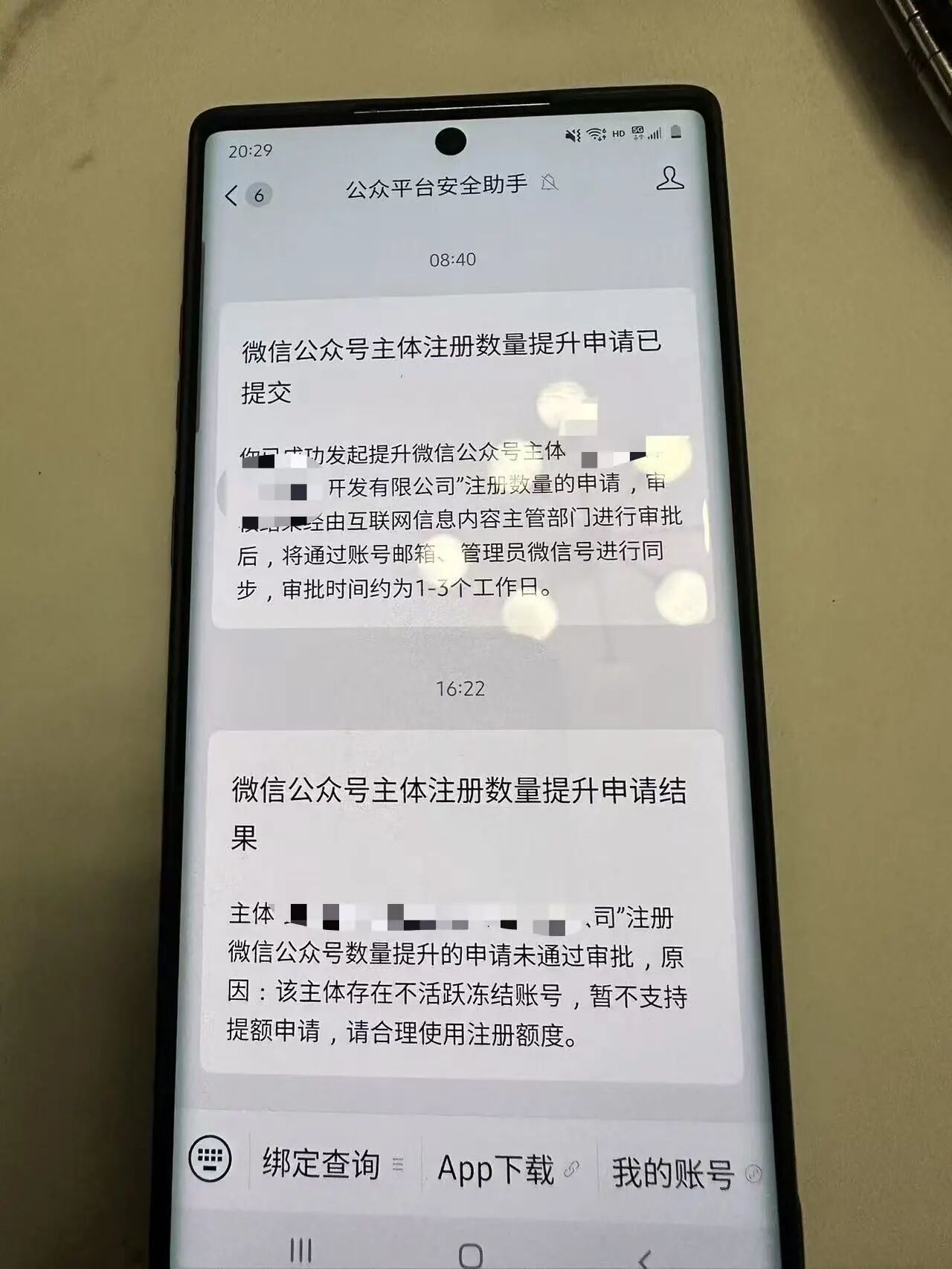 用公司和法人信息注册新公众号申请,按流程操作后,得到图片显示的回复。但是由于时间过长,已不知道管理员信息和账号信息(包括账号名、账号ID等)。那如何查询公司下面已注册过的账号,如何再以企业名义注册新的公众号。