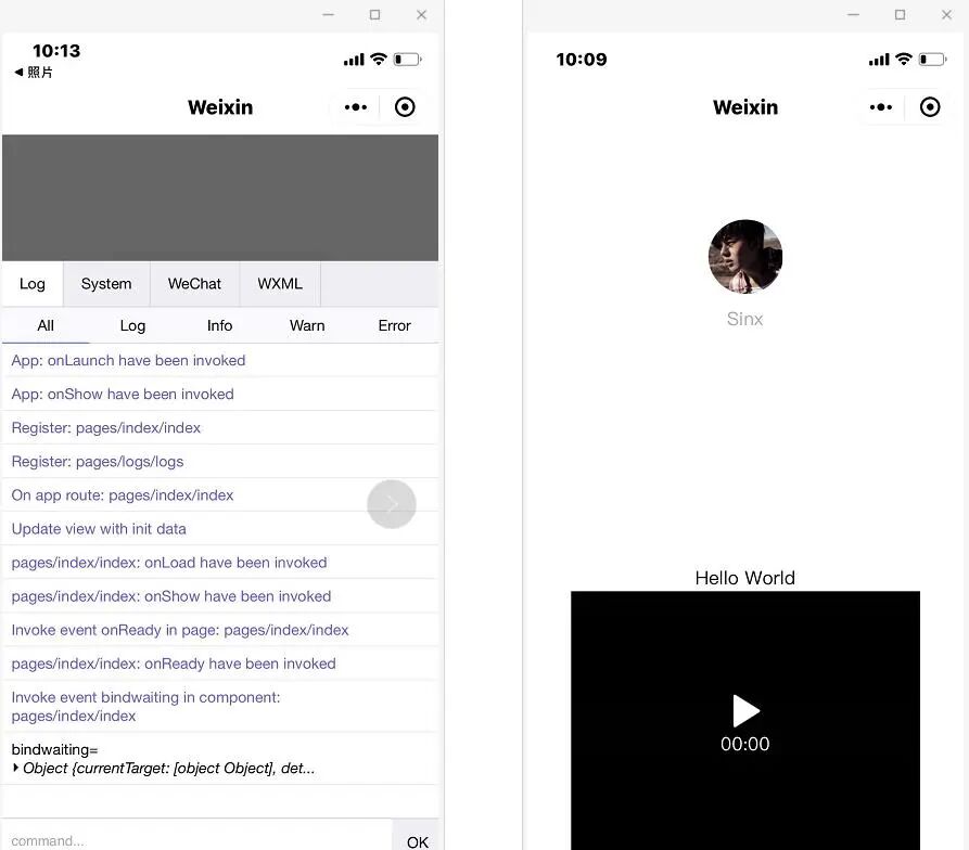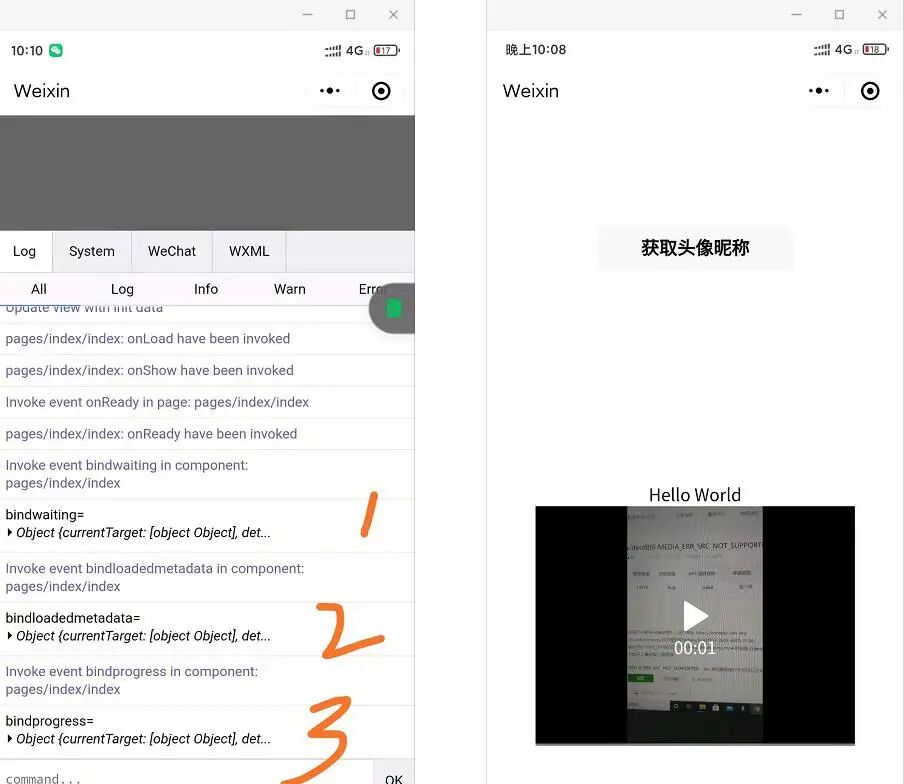 安卓机表现:左图(触发video组件三个事件[bindwaiting、bindloadedmetadata、bindprogress],完成视频加载,点击可播放)