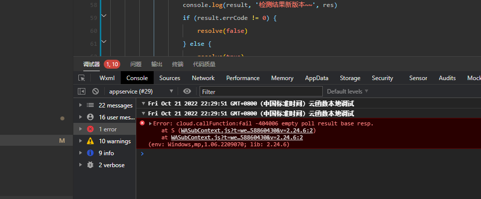 错误信息:WAServiceMainContext.js:2 Error: cloud.callFunction:fail -404006 empty poll result base resp.