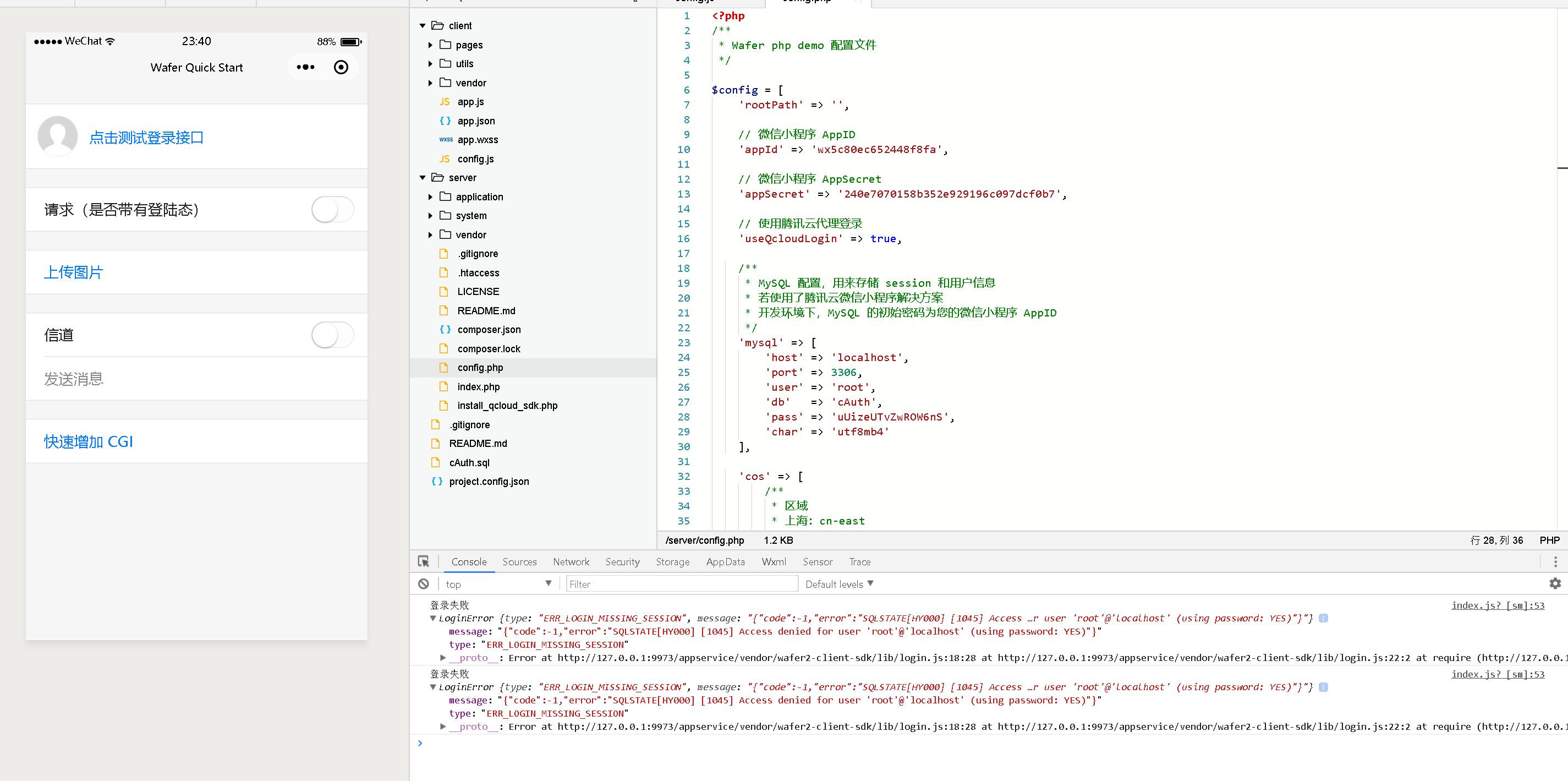 Wafer2-PHP 点击登录按钮报错,不知是不是数据库配置这里写的不对。