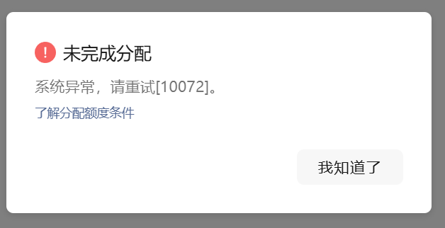 分配手机号快速验证组件提示“未完成分配 系统异常,请重试[10072]”