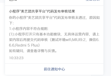 你好,经核实,贵方小程序【首页】、【附近】没有具体的商铺,无法体验小程序完整的功能,请上架符合小程序名称简介描述的正式内容,并保持图文一致!