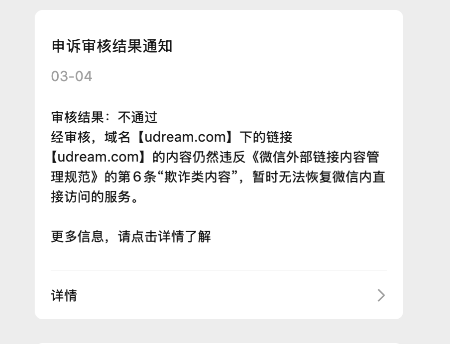 申述结果提示:域名 udrem.com下的链接:【udream.com】的内容仍然违反【微信外部链接内容管理规范】的第6条“欺诈类内容”,请问具体是哪个链接的资源有异常?我们快速处理。