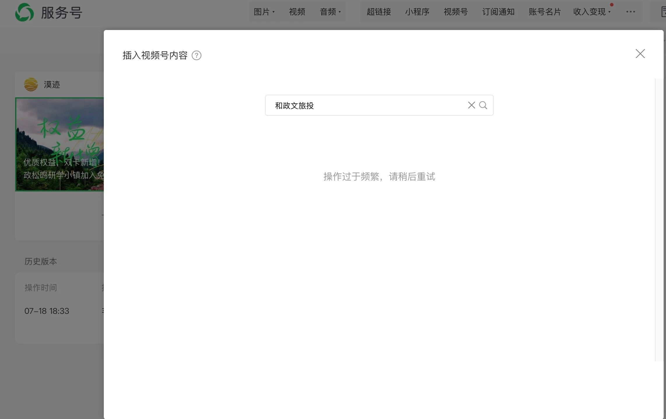 编辑公众号插入视频号的视频就显示“操作过于频繁”