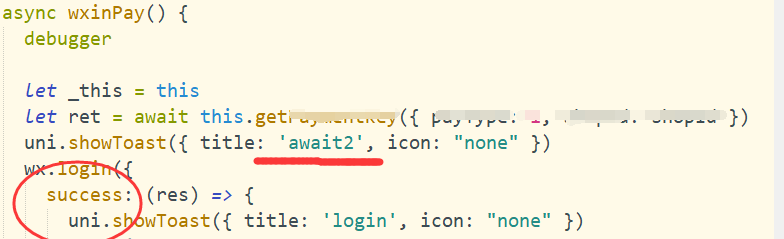 B小程序,线上一直无法支付,真机调试都正常的。执行到 uni.showToast({ title: 'await2', icon: "none" })就没了,两个都不能执行wx.login