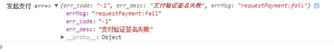wx.requestPayment({ 'timeStamp': data.timeStamp, 'nonceStr': data.nonceStr, 'package': data.package, 'signType': data.signType, 'paySign': data.paySign, // "total_fee": "1", 'success': function (res) { console.log("发起支付 res=>", res); }, 'fail': function (err) { console.log("发起支付 err=>", err); } }) |