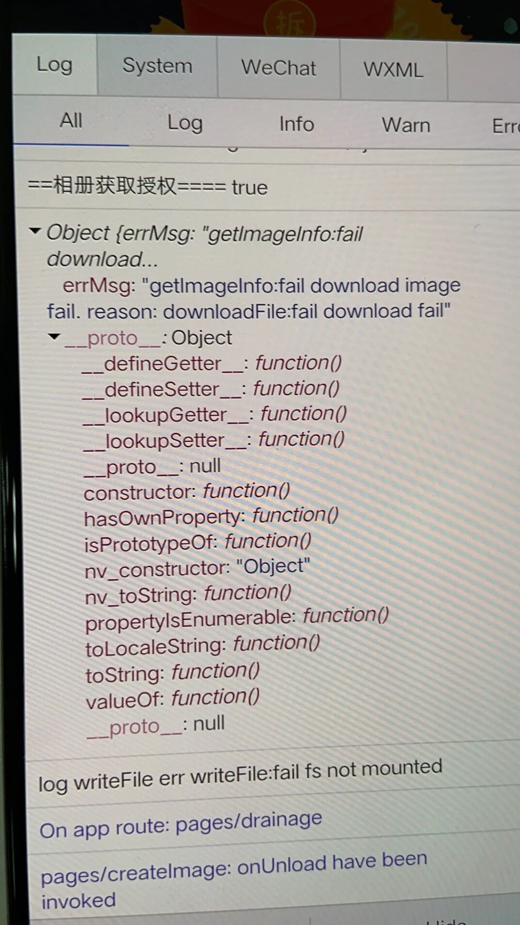 wx.getUserInfo({provider: 'weixin',success: function(infoRes) {wx.getImageInfo({src: infoRes.userInfo.avatarUrl,success(res) {console.log(1111);console.log(res);},fail(error) {console.log(2222);console.log(error);}});}});微信开发者工具上可以,真机上不行现在都是用<button open-type="getUserInfo" bindgetuserinfo="aaa"/>aaa(e) {console.log(e)} 这样来拿的。你那个早废弃了<button class="red flex" open-type="getUserInfo" bindgetuserinfo="getUserInfo">保存海报</button>