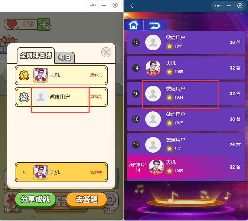 1、成语排行 https://developers.weixin.qq.com/s/6MOFUmmH77uM 2、听歌排行榜 https://developers.weixin.qq.com/s/TXOqCmmF7ruC