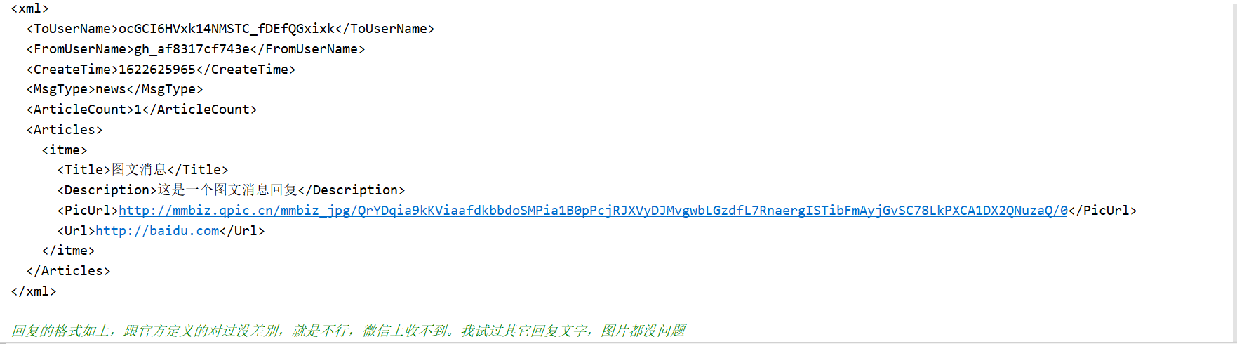 回复的格式如上,跟官方定义的对过没差别,就是不行,微信上收不到。我试过其它回复文字,图片都没问题