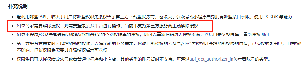 你好,需要商家操作主动解除授权。 第三方不能主动取消授权https://developers.weixin.qq.com/doc/oplatform/Third-party_Platforms/2.0/api/Before_Develop/Authorization_Process_Technical_Description.html